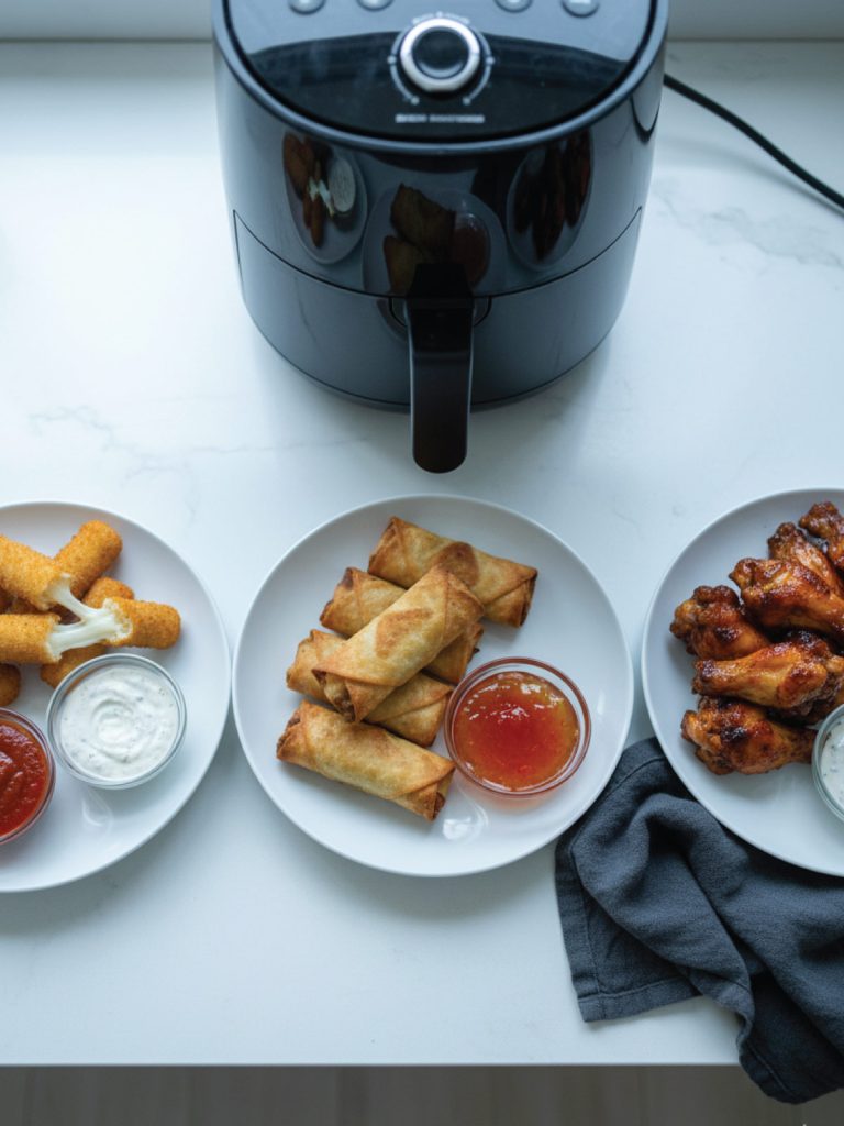 Three staples from the air fryer: egg rolls, mozzarella sticks, and